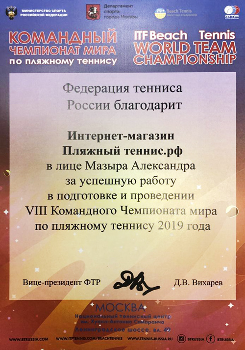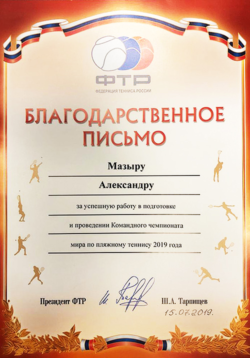 Конечно, сейчас нам приятно получать благодарственные письма от президента федерации тенниса России Шамиля Тарпищева, приятно получать благодарности от вице-президента федерации тенниса России Дмитрия Вихарева, который является первым лицом нашей страны по пляжному теннису.